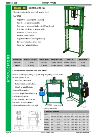 HYDRAULIC PRESSES Custom made presses also available: 508mm 200mm 650mm x 500mm Net Weight