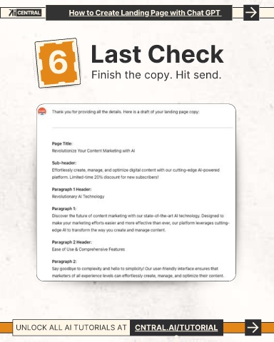 How to Create Landing Page with Chat GPT 6 Last Check Finish the copy. Hit send. UNLOCK ALL AI TUTORIALS AT CNTRAL.AI/TUTORIAL S