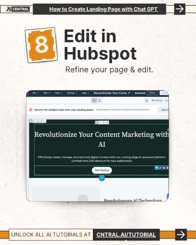 How to Create Landing Page with Chat GPT 8 Edit in Hubspot Refine your page & edit. UNLOCK ALL AI TUTORIALS AT CNTRAL.AI/TUTORIAL S