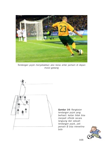 Tendangan pojok menyebabkan aksi keras antar pemain di depan mulut gawang Gambar 14: Rangkaian tendangan pojok yang berhasil: kalian tidak bisa menjadi offside secara langsung dari sebuah tendangan pojok, jadi pemain B bisa menerima bola 105