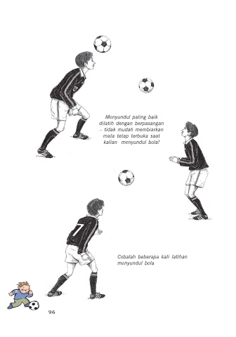 Menyundul paling baik dilatih dengan berpasangan – tidak mudah membiarkan mata tetap terbuka saat kalian menyundul bola! Cobalah beberapa kali latihan menyundul bola 96