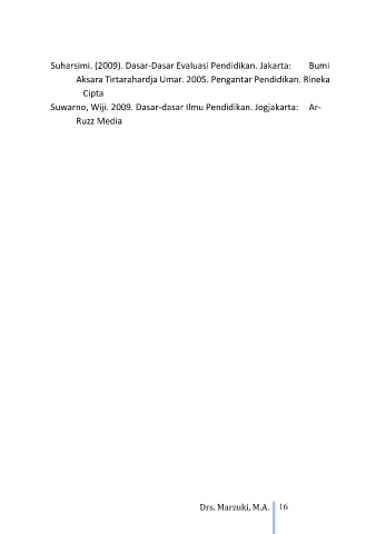 Suharsimi. (2009). Dasar-Dasar Evaluasi Pendidikan. Jakarta: Bumi Aksara Tirtarahardja Umar. 2005. Pengantar Pendidikan. Rineka Cipta Suwarno, Wiji. 2009. Dasar-dasar Ilmu Pendidikan. Jogjakarta: Ar- Ruzz Media Drs. Marzuki, M.A. 16