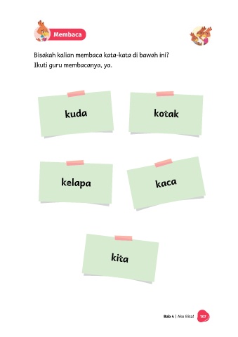 Membaca Bisakah kalian membaca kata-kata di bawah ini? Ikuti guru membacanya, ya. lupa lari kuda kotak lega lidah kelapa kaca lobak kita Bab 4 | Aku Bisa! 107