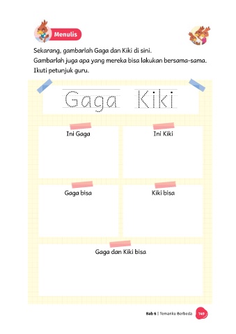 Menulis Sekarang, gambarlah Gaga dan Kiki di sini. Gambarlah juga apa yang mereka bisa lakukan bersama-sama. Ikuti petunjuk guru. Ini Gaga Ini Kiki Gaga bisa Kiki bisa Gaga dan Kiki bisa Bab 6 | Temanku Berbeda 149