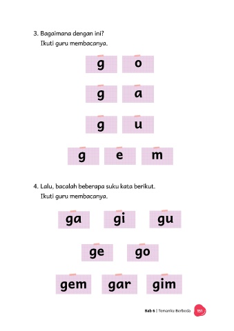 3. Bagaimana dengan ini? Ikuti guru membacanya. g o g a g u g e m 4. Lalu, bacalah beberapa suku kata berikut. Ikuti guru membacanya. ga gi gu ge go gem gar gim Bab 6 | Temanku Berbeda 151