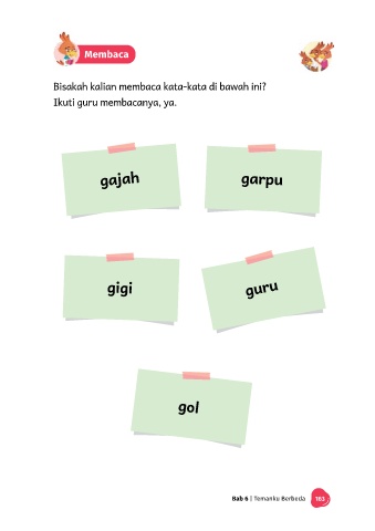 Membaca Bisakah kalian membaca kata-kata di bawah ini? Ikuti guru membacanya, ya. gajah garpu gigi guru gol Bab 6 | Temanku Berbeda 163