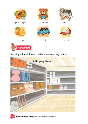 pe - ... - ya ... - ne - ka sa - ... ... - ruk ... - bil ... - pi Mengamati Amati gambar di bawah ini bersama seorang teman. Pilih yang Mana? 178 Bahasa Indonesia: Aku Bisa! untuk SD/MI Kelas I (Edisi Revisi)