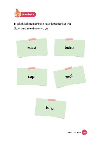 Membaca Bisakah kalian membaca kata-kata berikut ini? Ikuti guru membacanya, ya. susu buku sapi topi biru Bab 7 | Aku Ingin 193