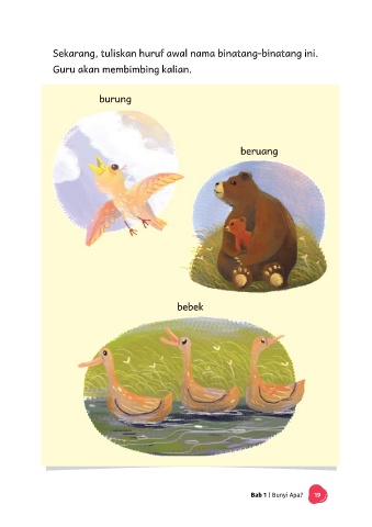 Sekarang, tuliskan huruf awal nama binatang-binatang ini. Guru akan membimbing kalian. burung beruang bebek Bab 1 | Bunyi Apa? 19