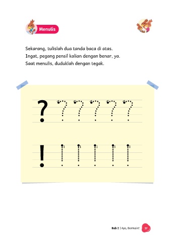 Menulis Sekarang, tulislah dua tanda baca di atas. Ingat, pegang pensil kalian dengan benar, ya. Saat menulis, duduklah dengan tegak. Bab 2 | Ayo, Bermain! 37