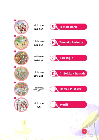 Halaman 5 Teman Baru 109-136 Halaman 6 Temanku Berbeda 139-164 Halaman 7 Aku Ingin 165-194 Halaman 8 Di Sekitar Rumah 195-221 Halaman Daftar Pustaka 222 Halaman Profil 225 vii