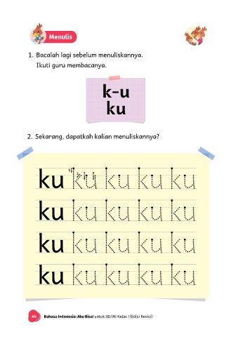 Menulis 1. Bacalah lagi sebelum menuliskannya. Ikuti guru membacanya. k-u ku 2. Sekarang, dapatkah kalian menuliskannya? 1 2 1 2 64 Bahasa Indonesia: Aku Bisa! untuk SD/MI Kelas I (Edisi Revisi)