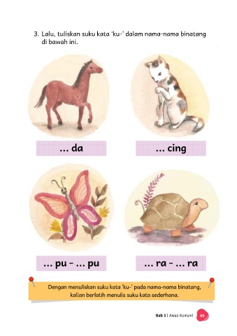 3. Lalu, tuliskan suku kata ‘ku-’ dalam nama-nama binatang di bawah ini. ... da ... cing ... pu - ... pu ... ra - ... ra Dengan menuliskan suku kata ‘ku-’ pada nama-nama binatang, kalian berlatih menulis suku kata sederhana. Bab 3 | Awas Kuman! 65