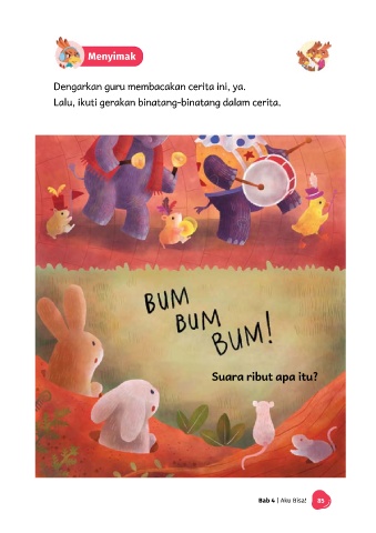Menyimak Dengarkan guru membacakan cerita ini, ya. Lalu, ikuti gerakan binatang-binatang dalam cerita. Suara ribut apa itu? Bab 4 | Aku Bisa! 85