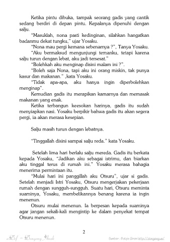 “Tinggallah disini sampai salju reda.” kata Yosaku.
