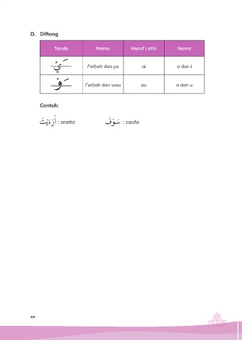 D. Diftong Tanda Nama Huruf Latin Nama Fatḥah dan ya ai a dan i Fatḥah dan wau au a dan u Contoh: َ ْ َ َ َ َ ْ َ تيءرا : araita فوس : saufa xx