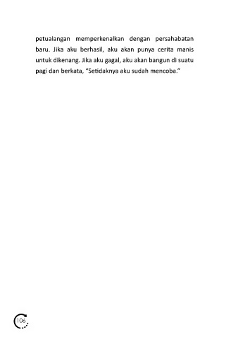 petualangan memperkenalkan dengan persahabatan baru. Jika aku berhasil, aku akan punya cerita manis untuk dikenang. Jika aku gagal, aku akan bangun di suatu pagi dan berkata, “Setidaknya aku sudah mencoba.” 106