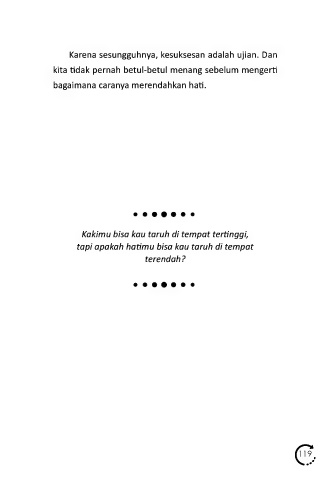 Karena sesungguhnya, kesuksesan adalah ujian. Dan kita tidak pernah betul-betul menang sebelum mengerti bagaimana caranya merendahkan hati. Kakimu bisa kau taruh di tempat tertinggi, tapi apakah hatimu bisa kau taruh di tempat terendah?