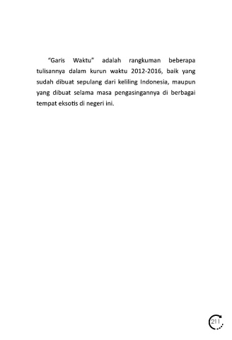“Garis Waktu” adalah rangkuman beberapa tulisannya dalam kurun waktu 2012-2016, baik yang sudah dibuat sepulang dari keliling Indonesia, maupun yang dibuat selama masa pengasingannya di berbagai tempat eksotis di negeri ini.