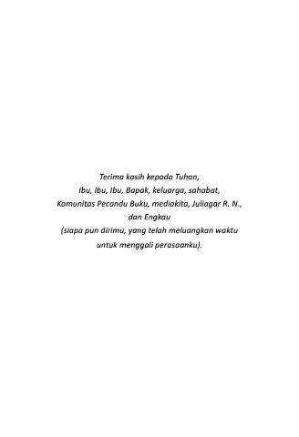 Terima kasih kepada Tuhan, Ibu, Ibu, Ibu, Bapak, keluarga, sahabat, Komunitas Pecandu Buku, mediakita, Juliagar R. N., dan Engkau (siapa pun dirimu, yang telah meluangkan waktu untuk menggali perasaanku).