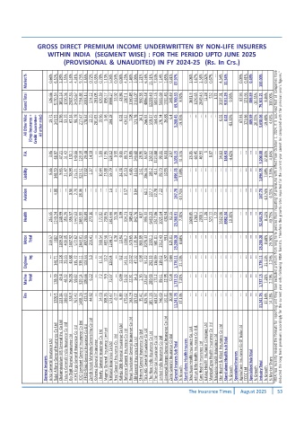 GROSS DIRECT PREMIUM INCOME UNDERWRITTEN BY NON-LIFE INSURERS WITHIN INDIA (SEGMENT WISE) : FOR THE PERIOD UPTO JUNE 2025 (PROVISIONAL & UNAUDITED) IN FY 2024-25 (Rs. In Crs.) The Insurance Times August 2025 53