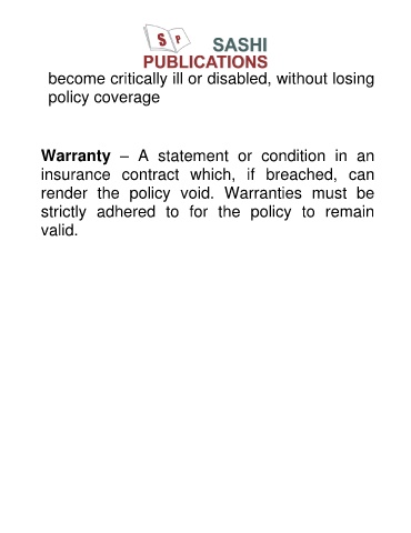become critically ill or disabled, without losing policy coverage Warranty – A statement or condition in an insurance contract which, if breached, can render the policy void. Warranties must be strictly adhered to for the policy to remain valid.