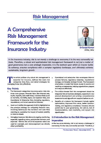 The framework categorizes insurance sector risks into The article stresses that risk management should be