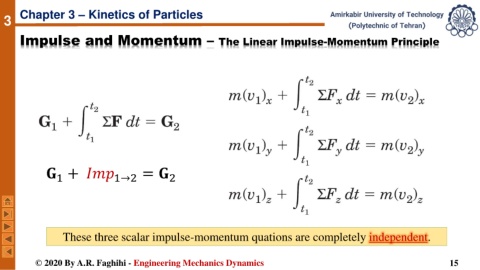 3 Chapter 3 – Kinetics of Particles Impulse and Momentum – The Linear Impulse-Momentum Principle + 1→2 = 2 1 These three scalar impulse-momentum quations are completely independent. © 2020 By A.R. Faghihi - Engineering Mechanics Dynamics 15