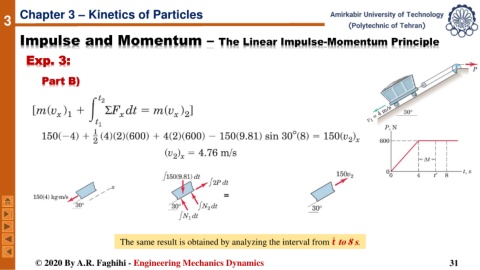 3 Chapter 3 – Kinetics of Particles Impulse and Momentum – The Linear Impulse-Momentum Principle Exp. 3: Part B) ƴ The same result is obtained by analyzing the interval from to 8 s . © 2020 By A.R. Faghihi - Engineering Mechanics Dynamics 31