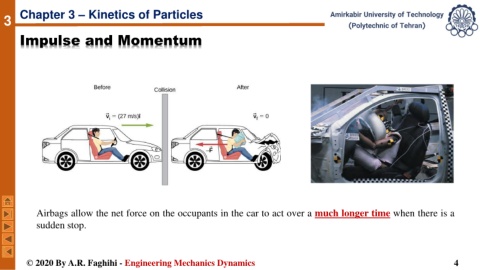 3 Chapter 3 – Kinetics of Particles Impulse and Momentum Airbags allow the net force on the occupants in the car to act over a much longer time when there is a sudden stop. © 2020 By A.R. Faghihi - Engineering Mechanics Dynamics 4