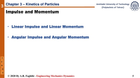 3 Chapter 3 – Kinetics of Particles Impulse and Momentum • Linear Impulse and Linear Momentum • Angular Impulse and Angular Momentum © 2020 By A.R. Faghihi - Engineering Mechanics Dynamics 5