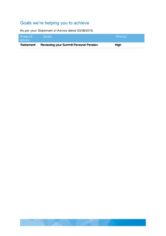 Goals we’re helping you to achieve As per your Statement of Advice dated 23/08/2019. Areas of Goals Priority advice Retirement Reviewing your Summit Personal Pension High