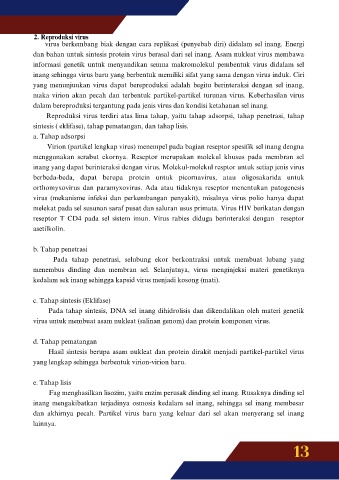 Reproduksi virus terdiri atas lima tahap, yaitu tahap adsorpsi, tahap penetrasi, tahap