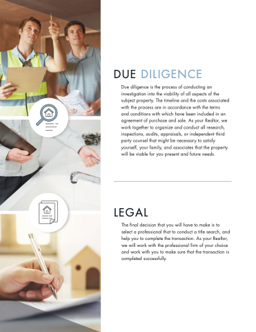 Due diligence is the process of conducting an investigation into the viability of all aspects of the subject property. The timeline and the costs associated with the process are in accordance with the terms