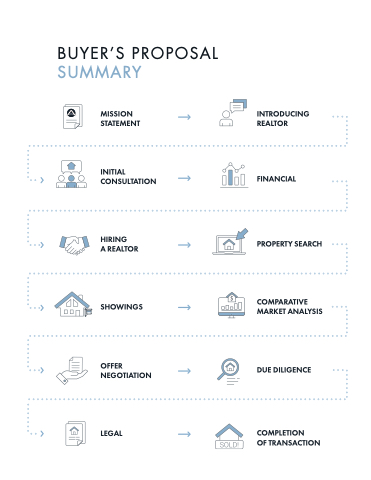 BUYER’S PROPOSAL SUMMARY MISSION STATEMENT INITIAL CONSULTATION HIRING A REALTOR SHOWINGS OFFER NEGOTIATION $ INTRODUCING REALTOR FINANCIAL PROPERTY SEARCH COMPARATIVE MARKET ANALYSIS DUE DILIGENCE COMPLETION LEGAL OF TRANSACTION