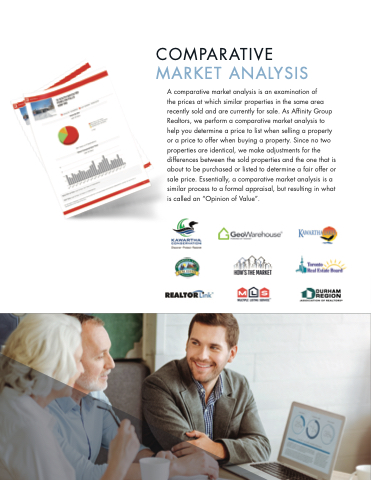 the prices at which similar properties in the same area recently sold and are currently for sale. As Affinity Group Realtors, we perform a comparative market analysis to help you determine a price to list when selling a property or a price to offer when buying a property. Since no two properties are identical, we make adjustments for the differences between the sold properties and the one that is about to be purchased or listed to determine a fair offer or sale price. Essentially, a comparative market analysis is a similar process to a formal appraisal, but resulting in what is called an “Opinion of Value”.