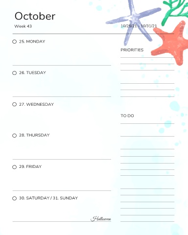 October Week 43 10/25/21 - 10/31/21 25. MONDAY PRIORITIES 26. TUESDAY 27. WEDNESDAY TO DO 28. THURSDAY 29. FRIDAY 30. SATURDAY / 31. SUNDAY Halloween