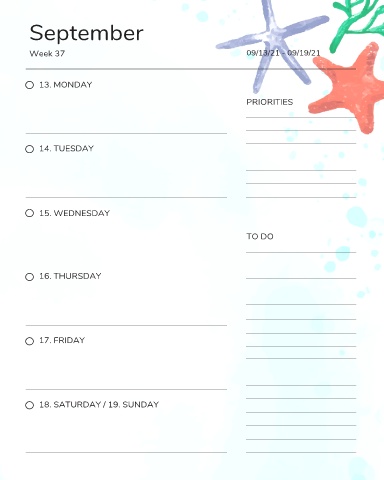 September Week 37 09/13/21 - 09/19/21 13. MONDAY PRIORITIES 14. TUESDAY 15. WEDNESDAY TO DO 16. THURSDAY 17. FRIDAY 18. SATURDAY / 19. SUNDAY