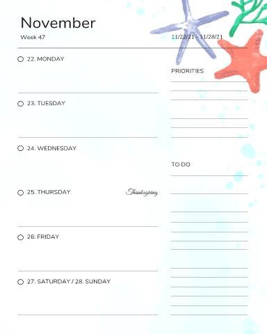 November Week 47 11/22/21 - 11/28/21 22. MONDAY PRIORITIES 23. TUESDAY 24. WEDNESDAY TO DO 25. THURSDAY Thanksgiving 26. FRIDAY 27. SATURDAY / 28. SUNDAY