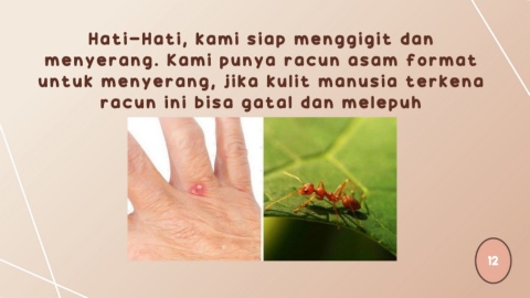 Hati-Hati, kami siap menggigit dan menyerang. Kami punya racun asam format j untuk menyerang, ika kulit manusia terkena racun ini bisa gatal dan melepuh 12
