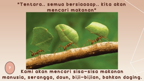 “Tentara.. semua bersiaaaap.. kita akan mencari makanan” 7 Kami akan mencari sisa-sisa makanan manusia, serangga, daun, biji-bijian, bahkan daging.