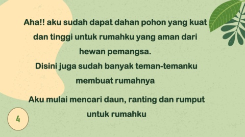 Aha!! aku sudah dapat dahan pohon yang kuat dan tinggi untuk rumahku yang aman dari hewan pemangsa. Disini juga sudah banyak teman-temanku membuat rumahnya Aku mulai mencari daun, ranting dan rumput untuk rumahku 4