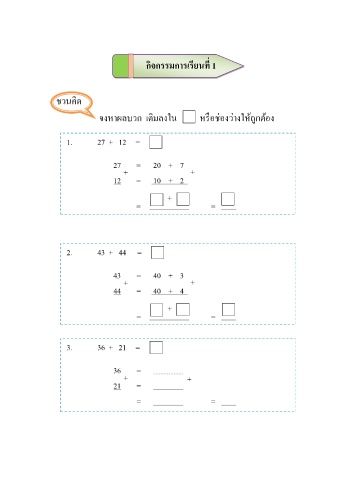 กิจกรรมการเรยนที่ 1 ี ชวนคด ิ ิ จงหาผลบวก เตมลงใน หรอช่องว่างให้ถูกต้อง ื 1. 27 + 12 = 27 + = 20 + 7 + 12 = 10 + 23 + = 3 5+ = 3548 2. 43 + 44 = 43 + = 40 + 3 + 44 = 40 + 43 + = 3 5+ = 3548 3. 36 + 21 = 36 + = 40 + 3 + 21 = 40 43 = 5+ = 3548