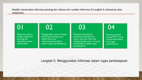 Setelah menemukan informasi penting dan relevan dari sumber informasi di Langkah 4, mahasiswa akan