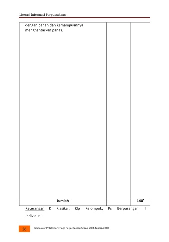 Literasi Informasi Perpustakaan dengan bahan dan kemampuannya menghantarkan panas. Jumlah 140’ Keterangan: K = Klasikal; Klp = Kelompok; Ps = Berpasangan; I = Individual. 26 Bahan Ajar Pelatihan Tenaga Perpustakaan Sekolah/Dit.Tendik/2010