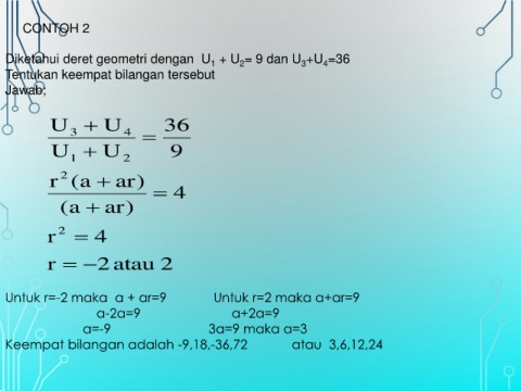 Untuk r=-2 maka a + ar=9 Untuk r=2 maka a+ar=9
