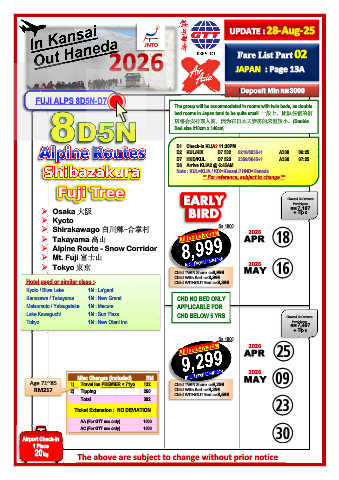 FUJI ALPS 8D5N-D7 The group will be accommodated in rooms with twin beds, as double