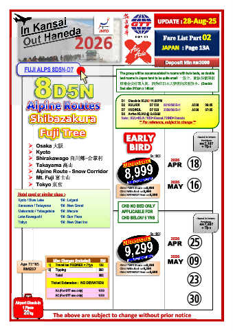 FUJI ALPS 8D5N-D7 The group will be accommodated in rooms with twin beds, as double