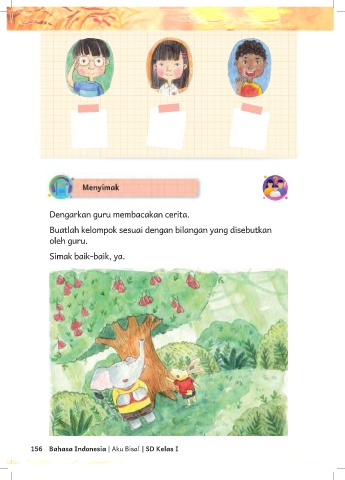 Dengarkan guru membacakan cerita. Buatlah kelompok sesuai dengan bilangan yang disebutkan oleh guru. Simak baik-baik, ya. 156 Bahasa Indonesia | Aku Bisa! | SD Kelas I