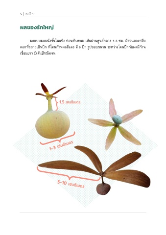 ผลของรักใหญ่ ผลแบบผลผนังชั้นในแข็ง ค่อนข้ำงกลม เส้นผ่ำนศูนย์กลำง 1-3 ซม. มีส่วนของกลีบ ่ ี ี ี ็ ดอกทีขยำยเปนปก ทีโคนก้ำนผลสีแดง มี 5 ปก รูปขอบขนำน ระหว่ำงโคนปกกับผลมีก้ำน ่ เชื่อมยำว มีเส้นปกชัดเจน ี